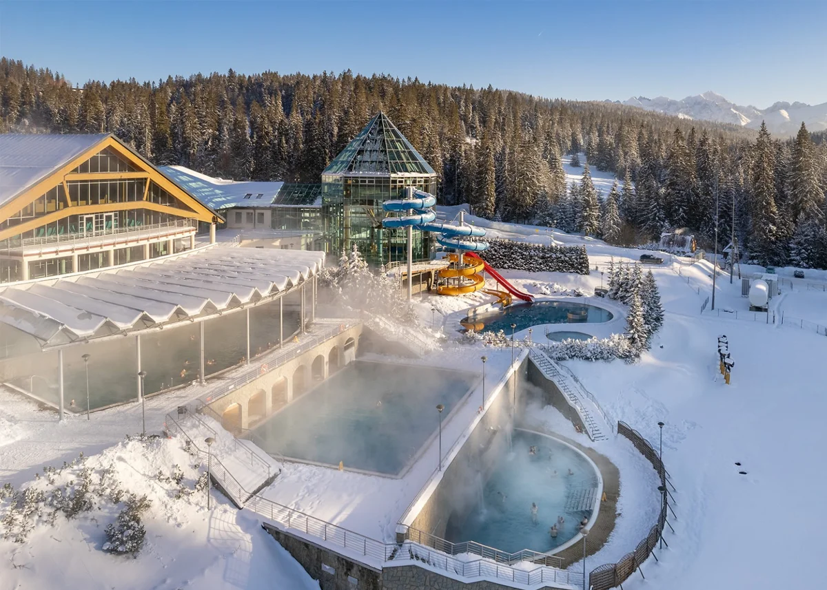 Relaks w gorących basenach z widokiem na Tatry masz dosłownie kilka minut od domków — idealne zakończenie dnia po górach lub nartach.